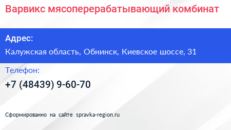Варвикс, мясоперерабатывающий комбинат по адресу Калужская область, Обнинск, Киевское шоссе, 31 в дальнейшем Организация, размещена в следующих категориях: