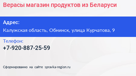 Верасы, магазин продуктов из Беларуси по адресу Калужская область, Обнинск, улица Курчатова, 9 в дальнейшем Организация, размещена в следующих категориях: