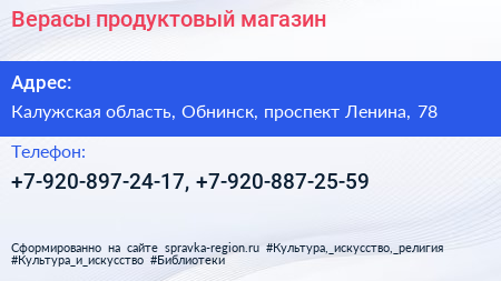 Верасы, продуктовый магазин по адресу Калужская область, Обнинск, проспект Ленина, 78 в дальнейшем Организация, размещена в следующих категориях: