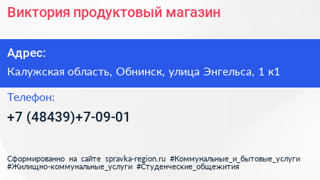 Виктория, продуктовый магазин по адресу Калужская область, Обнинск, улица Энгельса, 1 к1 в дальнейшем Организация, размещена в следующих категориях: