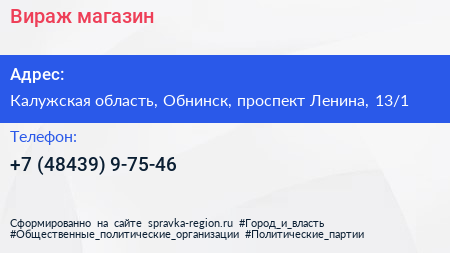 Вираж, магазин по адресу Калужская область, Обнинск, проспект Ленина, 13/1 в дальнейшем Организация, размещена в следующих категориях: