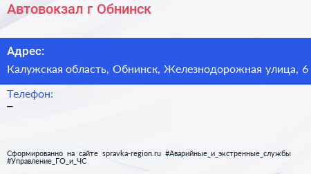Автовокзал, г. Обнинск по адресу Калужская область, Обнинск, Железнодорожная улица, 6 в дальнейшем Организация, размещена в следующих категориях: