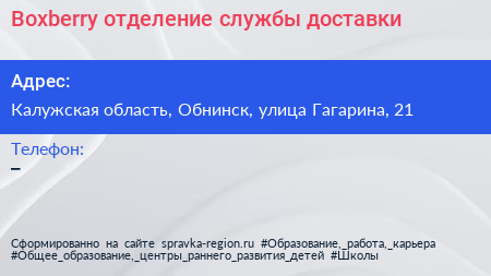 Boxberry, отделение службы доставки по адресу Калужская область, Обнинск, улица Гагарина, 21 в дальнейшем Организация, размещена в следующих категориях: