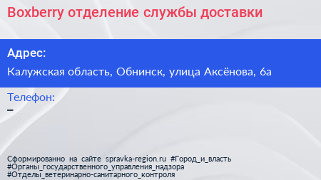 Boxberry, отделение службы доставки по адресу Калужская область, Обнинск, улица Аксёнова, 6а в дальнейшем Организация, размещена в следующих категориях: