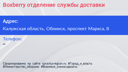 Boxberry, отделение службы доставки по адресу Калужская область, Обнинск, проспект Маркса, 8 в дальнейшем Организация, размещена в следующих категориях: