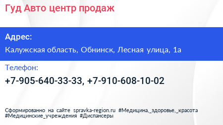 Гуд Авто, центр продаж по адресу Калужская область, Обнинск, Лесная улица, 1а в дальнейшем Организация, размещена в следующих категориях: