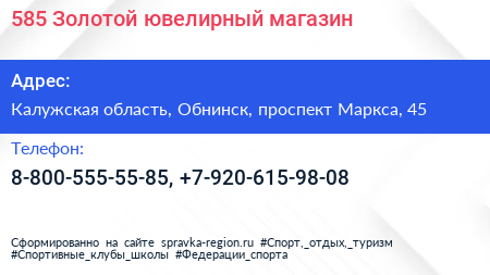 585 Золотой, ювелирный магазин по адресу Калужская область, Обнинск, проспект Маркса, 45 в дальнейшем Организация, размещена в следующих категориях: