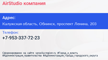 AirStudio, компания по адресу Калужская область, Обнинск, проспект Ленина, 203 в дальнейшем Организация, размещена в следующих категориях: