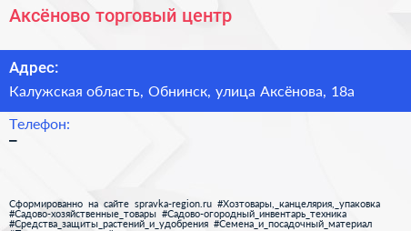 Аксёново, торговый центр по адресу Калужская область, Обнинск, улица Аксёнова, 18а в дальнейшем Организация, размещена в следующих категориях: