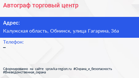 Автограф, торговый центр по адресу Калужская область, Обнинск, улица Гагарина, 36а в дальнейшем Организация, размещена в следующих категориях: