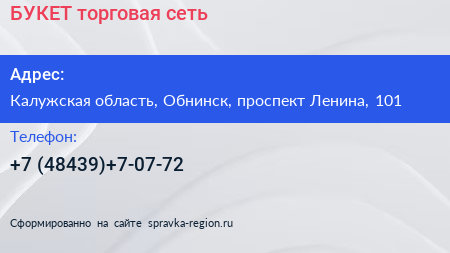 БУКЕТ, торговая сеть по адресу Калужская область, Обнинск, проспект Ленина, 101 в дальнейшем Организация, размещена в следующих категориях: