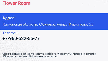 Flower Room по адресу Калужская область, Обнинск, улица Курчатова, 55 в дальнейшем Организация, размещена в следующих категориях: