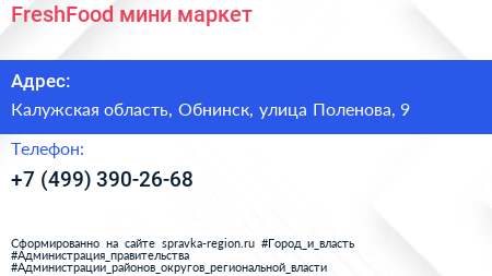 FreshFood, мини-маркет по адресу Калужская область, Обнинск, улица Поленова, 9 в дальнейшем Организация, размещена в следующих категориях: