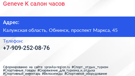 Geneve & K, салон часов по адресу Калужская область, Обнинск, проспект Маркса, 45 в дальнейшем Организация, размещена в следующих категориях: