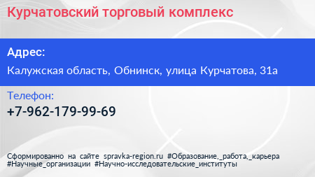 Курчатовский, торговый комплекс по адресу Калужская область, Обнинск, улица Курчатова, 31а в дальнейшем Организация, размещена в следующих категориях: