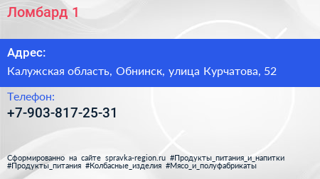 Ломбард №1 по адресу Калужская область, Обнинск, улица Курчатова, 52 в дальнейшем Организация, размещена в следующих категориях:
