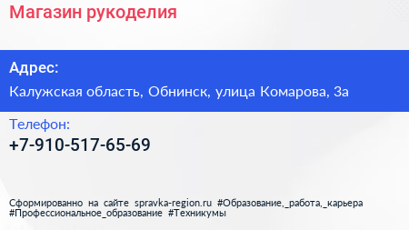 Магазин рукоделия по адресу Калужская область, Обнинск, улица Комарова, 3а в дальнейшем Организация, размещена в следующих категориях: