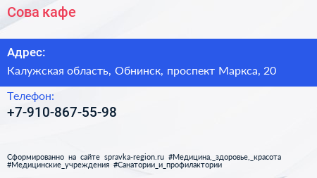 Сова, кафе по адресу Калужская область, Обнинск, проспект Маркса, 20 в дальнейшем Организация, размещена в следующих категориях: