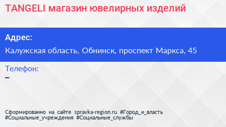 TANGELI, магазин ювелирных изделий по адресу Калужская область, Обнинск, проспект Маркса, 45 в дальнейшем Организация, размещена в следующих категориях: