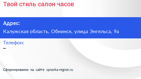 Твой стиль, салон часов по адресу Калужская область, Обнинск, улица Энгельса, 9а в дальнейшем Организация, размещена в следующих категориях: