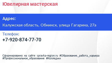 Ювелирная мастерская по адресу Калужская область, Обнинск, улица Гагарина, 27а в дальнейшем Организация, размещена в следующих категориях: