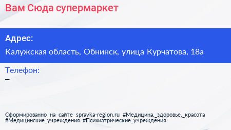 Вам Сюда, супермаркет по адресу Калужская область, Обнинск, улица Курчатова, 18а в дальнейшем Организация, размещена в следующих категориях:
