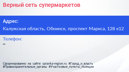 Верный, сеть супермаркетов по адресу Калужская область, Обнинск, проспект Маркса, 128 к12 в дальнейшем Организация, размещена в следующих категориях: