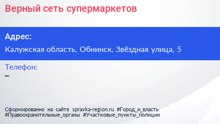 Верный, сеть супермаркетов по адресу Калужская область, Обнинск, Звёздная улица, 5 в дальнейшем Организация, размещена в следующих категориях: