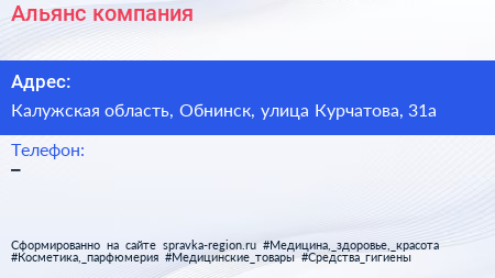 Альянс, компания по адресу Калужская область, Обнинск, улица Курчатова, 31а в дальнейшем Организация, размещена в следующих категориях: