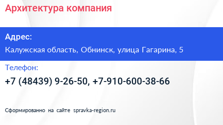 Архитектура, компания по адресу Калужская область, Обнинск, улица Гагарина, 5 в дальнейшем Организация, размещена в следующих категориях: