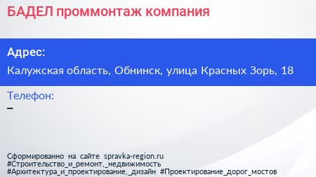 БАДЕЛ проммонтаж, компания по адресу Калужская область, Обнинск, улица Красных Зорь, 18 в дальнейшем Организация, размещена в следующих категориях: