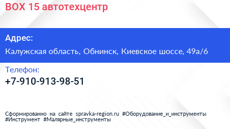 BOX 15, автотехцентр по адресу Калужская область, Обнинск, Киевское шоссе, 49а/6 в дальнейшем Организация, размещена в следующих категориях: