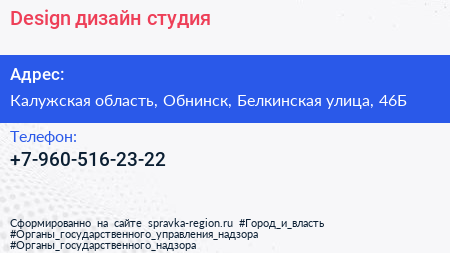Design, дизайн студия по адресу Калужская область, Обнинск, Белкинская улица, 46Б в дальнейшем Организация, размещена в следующих категориях: