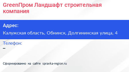 GreenПром Ландшафт, строительная компания по адресу Калужская область, Обнинск, Долгининская улица, 4 в дальнейшем Организация, размещена в следующих категориях: