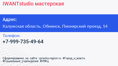 IWANTstudio, мастерская по адресу Калужская область, Обнинск, Пионерский проезд, 14 в дальнейшем Организация, размещена в следующих категориях: