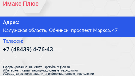 Имакс-Плюс по адресу Калужская область, Обнинск, проспект Маркса, 47 в дальнейшем Организация, размещена в следующих категориях: