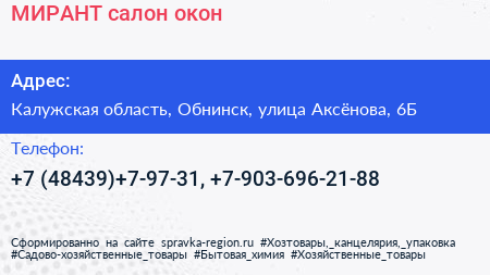 МИРАНТ, салон окон по адресу Калужская область, Обнинск, улица Аксёнова, 6Б в дальнейшем Организация, размещена в следующих категориях: