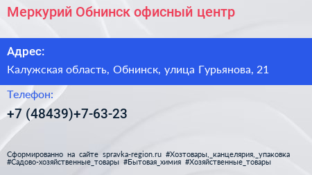 Меркурий-Обнинск, офисный центр по адресу Калужская область, Обнинск, улица Гурьянова, 21 в дальнейшем Организация, размещена в следующих категориях: