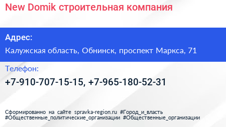 New Domik, строительная компания по адресу Калужская область, Обнинск, проспект Маркса, 71 в дальнейшем Организация, размещена в следующих категориях:
