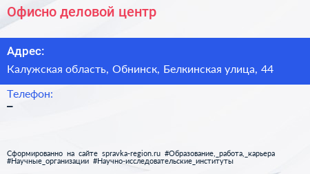 Офисно-деловой центр по адресу Калужская область, Обнинск, Белкинская улица, 44 в дальнейшем Организация, размещена в следующих категориях:
