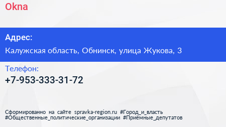 Okna по адресу Калужская область, Обнинск, улица Жукова, 3 в дальнейшем Организация, размещена в следующих категориях:
