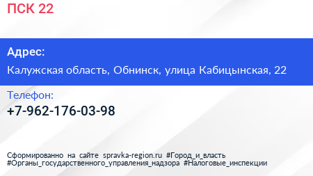 ПСК 22 по адресу Калужская область, Обнинск, улица Кабицынская, 22 в дальнейшем Организация, размещена в следующих категориях: