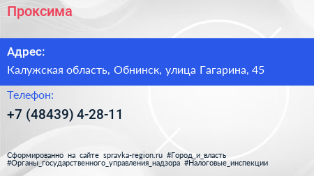 Проксима по адресу Калужская область, Обнинск, улица Гагарина, 45 в дальнейшем Организация, размещена в следующих категориях: