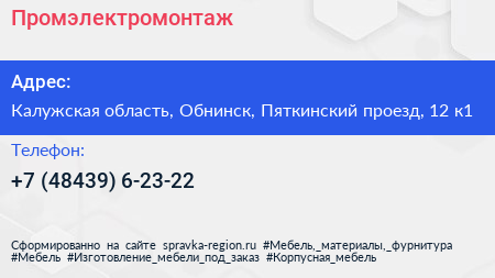 Промэлектромонтаж по адресу Калужская область, Обнинск, Пяткинский проезд, 12 к1 в дальнейшем Организация, размещена в следующих категориях: