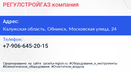 РЕГУЛСТРОЙГАЗ, компания по адресу Калужская область, Обнинск, Московская улица, 24 в дальнейшем Организация, размещена в следующих категориях:
