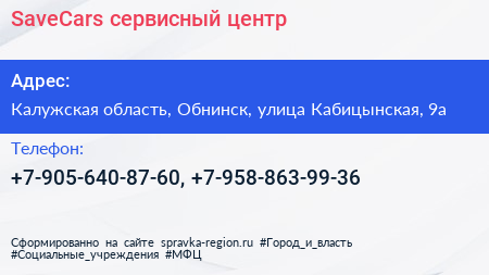 SaveCars, сервисный центр по адресу Калужская область, Обнинск, улица Кабицынская, 9а в дальнейшем Организация, размещена в следующих категориях: