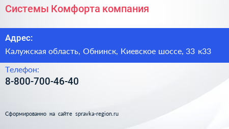 Системы Комфорта, компания по адресу Калужская область, Обнинск, Киевское шоссе, 33 к33 в дальнейшем Организация, размещена в следующих категориях: