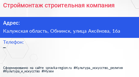 Строймонтаж, строительная компания по адресу Калужская область, Обнинск, улица Аксёнова, 16а в дальнейшем Организация, размещена в следующих категориях: