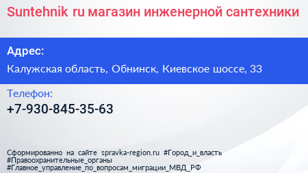 Suntehnik.ru, магазин инженерной сантехники по адресу Калужская область, Обнинск, Киевское шоссе, 33 в дальнейшем Организация, размещена в следующих категориях: