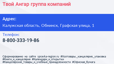 Твой Ангар, группа компаний по адресу Калужская область, Обнинск, Графская улица, 1 в дальнейшем Организация, размещена в следующих категориях: